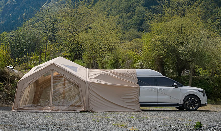 Connects to your tent with a zipper and attaches to the vehicle by covering it.